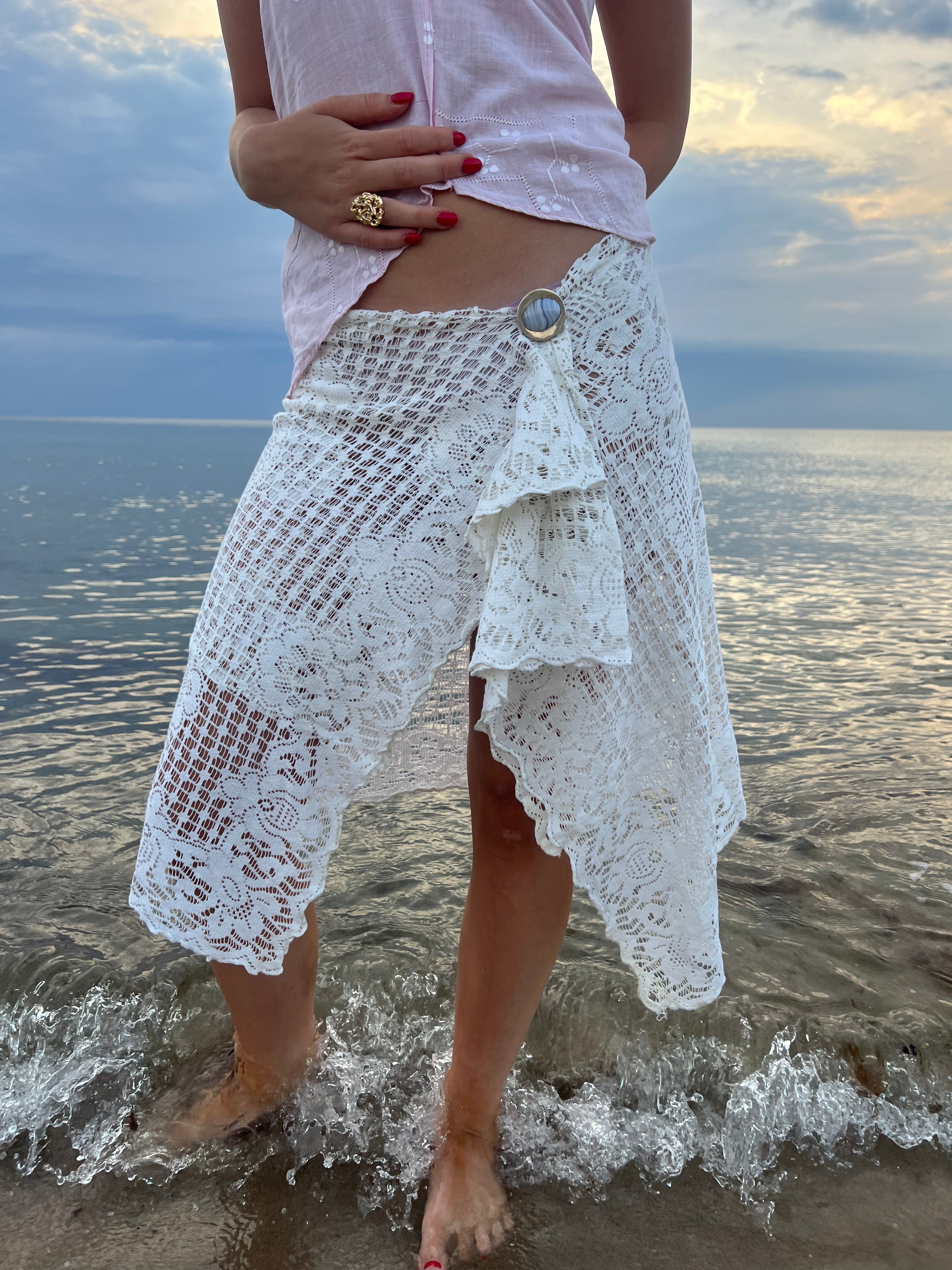 Three preloved crocheted curtains have been sewn together to create this skirt. Making it a reunion of the window they once hung in, sharing observations of the world outside.