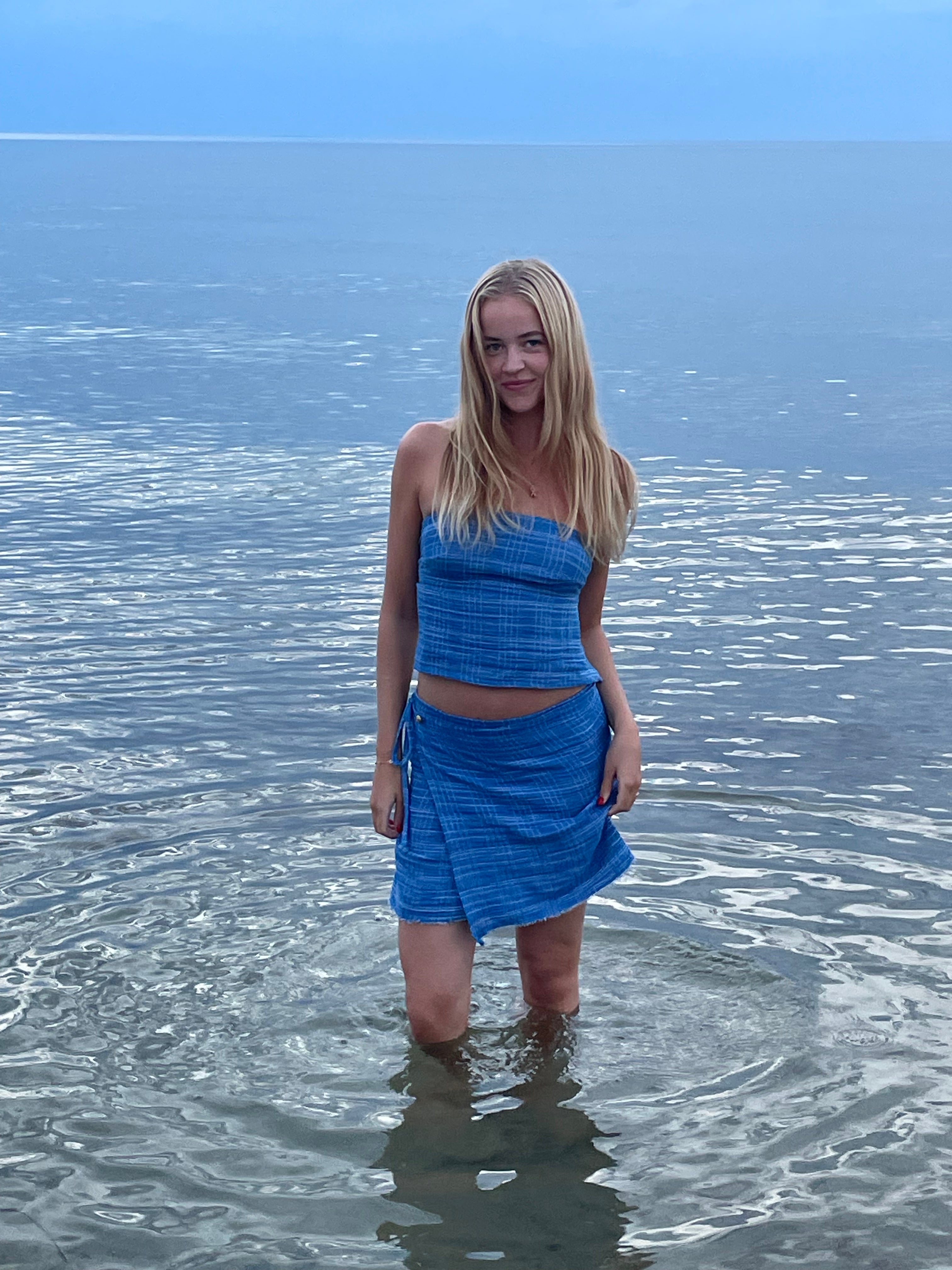 The inspiration behind this set wasn't clear to us until we saw it on Lise, our beloved friend. She suddenly stood there, becoming part of the sea at twilight, as beautiful as a mermaid. Instantly, we knew where the inspiration had come from.